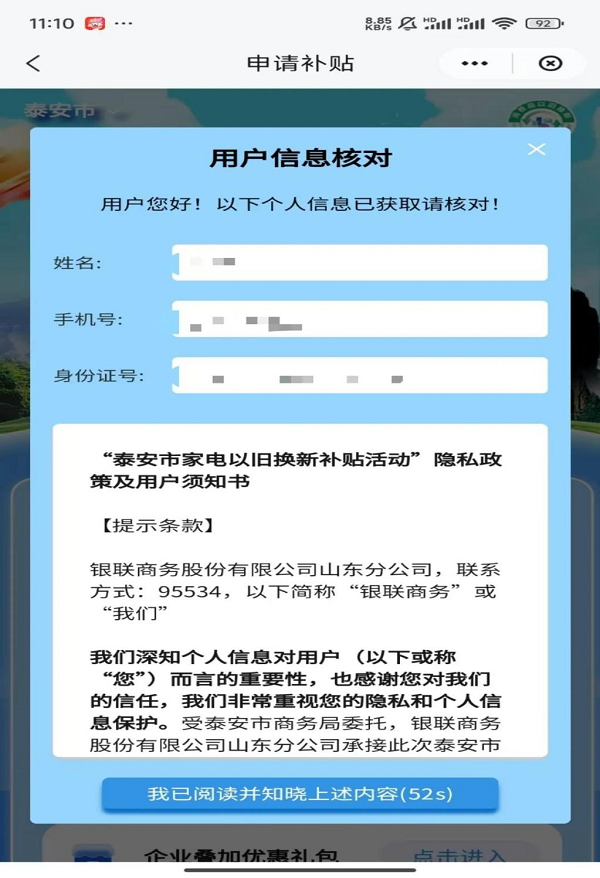 【申請補貼】用戶點擊進(jìn)入“家電補貼券申請”界面,系統(tǒng)彈窗提示授權(quán)申請,用戶同意云閃付 APP 授權(quán)“魯換新”小程序獲取注冊手機號、姓名、證件號信息,進(jìn)入“用戶信息核對”界面,信息核對無誤后,點擊“我已閱讀并知曉上述內(nèi)容”。