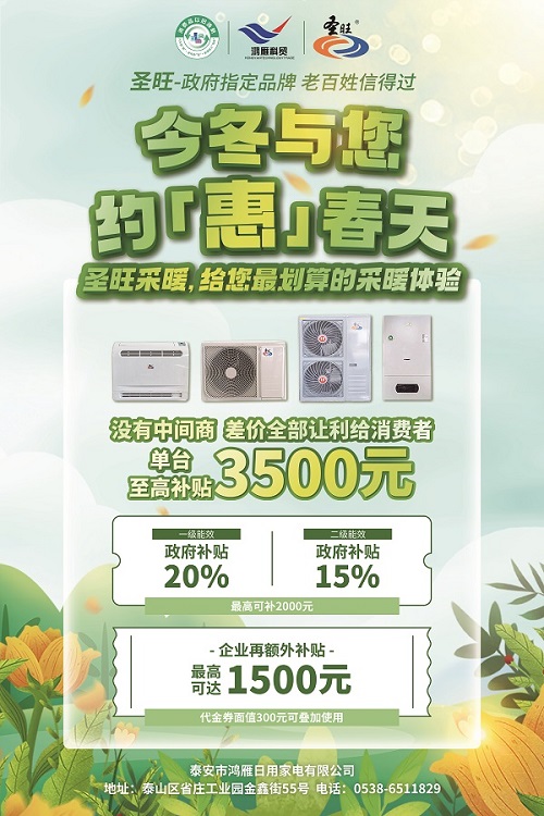 在這個寒冷的季節(jié),選擇圣旺品牌的空氣源熱泵熱風(fēng)機、燃?xì)獗趻鞝t及空氣能機組等采暖設(shè)備,不僅能享受優(yōu)惠補貼,更是為環(huán)保貢獻一份力量。歡迎廣大消費者前來選購,讓我們一起溫暖過冬!