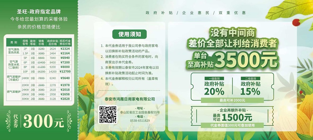 如今,泰安市舉行家電以舊換新補貼政策,我公司三類產(chǎn)品成功入圍,包括空氣源熱泵熱風(fēng)機、冷水機組和燃?xì)獗趻鞝t。消費者購買我公司一級能耗產(chǎn)品可享受政府 20%的補貼,二級能耗產(chǎn)品可享受 15%的補貼。在此基礎(chǔ)上,我們面向全市消費者再額外發(fā)放 300 萬的代金券,單張面值 300 元,共 1 萬張。這意味著在政府補貼的同時,消費者還能享受我公司讓利 300 至最高 1500 元的優(yōu)惠,真正實現(xiàn)政企雙補,福利翻倍。